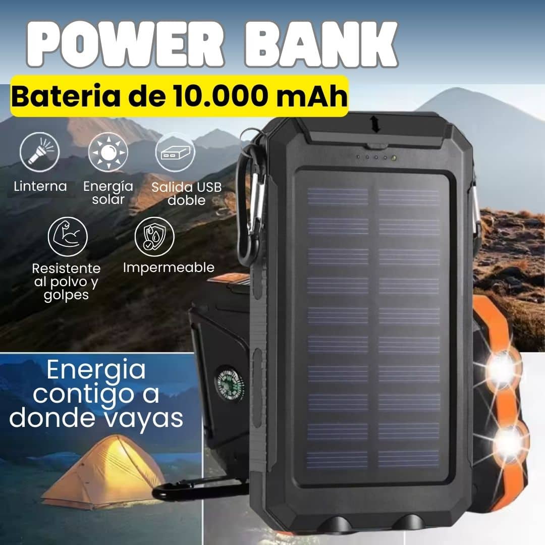 El Power Bank con panel solar incorporado con 10.000 mAh te da energía ilimitada al aire libre, podrás cargar tu celular, tablet o cualquier dispositivo, todo con el poder del sol, sin depender de enchufes, cables o pilas