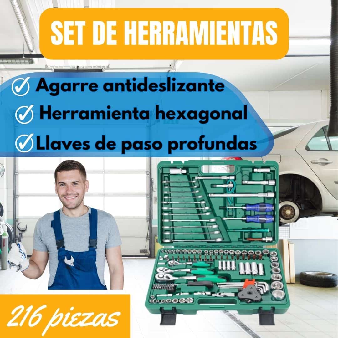 Nuestro Juego de Herramientas de 216 Piezas es la solución integral para tus necesidades. Fabricado en acero cromo vanadio, ofrece resistencia y durabilidad excepcionales. Su estuche organizado te permite tener todo al alcance de la mano, ya sea en el taller, el hogar o en proyectos de bricolaje.